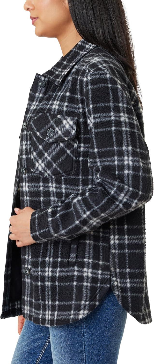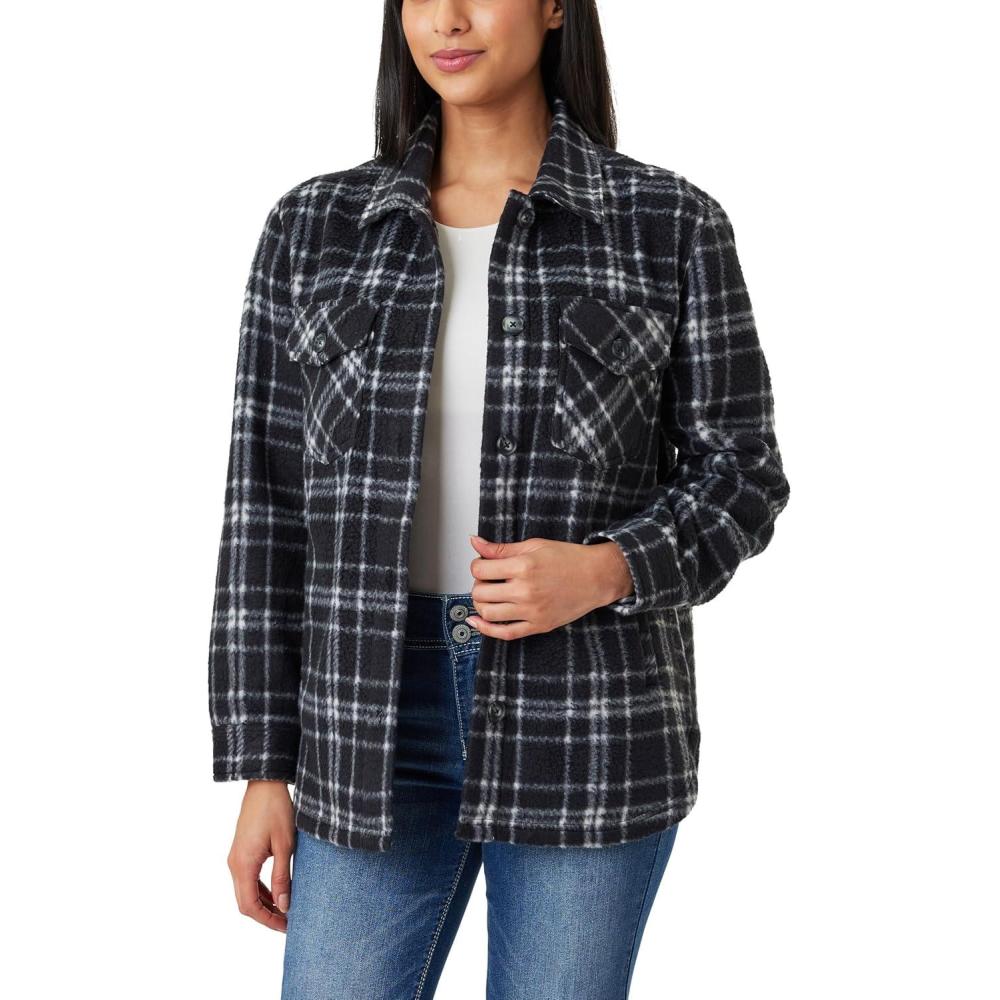 WallFlower Casual Fleece and Plaid Shackets Jackets Juniors for Women, Soft Button-Down(Black/White)
