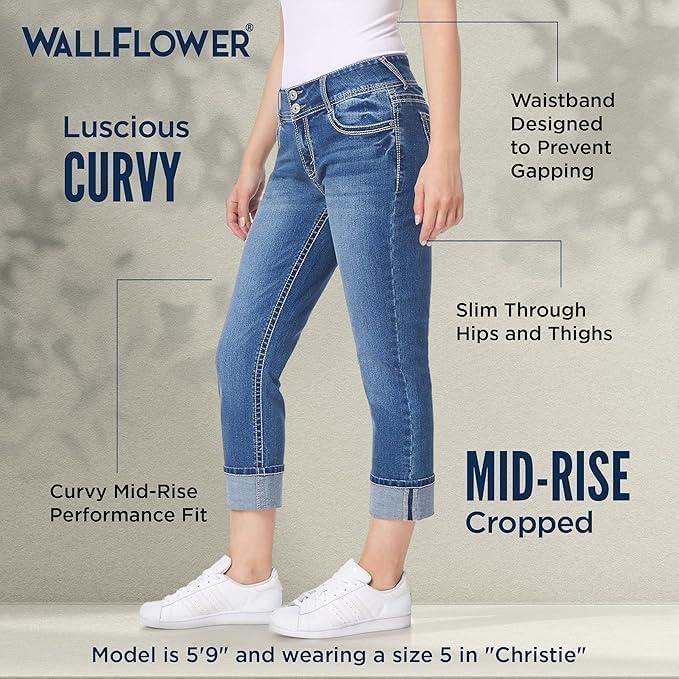Wallflower capris for women in Insta Stretch denim is our stretchiest ever, with outstanding recovery that keeps your wall flower jeans crop jeans looking amazing all day. The premium feel and endless holding power will make these your new favorite womens jeans cropped. Complete your look with our curve enhancing, mid rise women jeans stretch cropped jeans for women that flatter your legs. The contoured stretchy jeans for women mid-rise waistband and roomier hips and thighs eliminate gapping so you can move with confidence. Maintain your cool and casual style with womens cropped jeans that flatter every figure. Classic double button closure detail and embellished back pockets on stretch wallflower jeans crop jeans for women that go with everything. Complete your 90s, y2k, festival and everyday looks with jeans for women trendy. Look and feel amazing, from size 0 to 24. Find standard and plus size crop jeans, in a 23.5” cropped inseam. Jeans women made for Every Body. Period. Mid rise capris for women in always in style denim fabric. Join our journey to more eco-friendly processes for more sustainable garments. By 2026, we at wallflower aim to source 50% of our cotton through the Better Cotton program—supporting water-efficient farming practices that benefit both farmers and the environment.