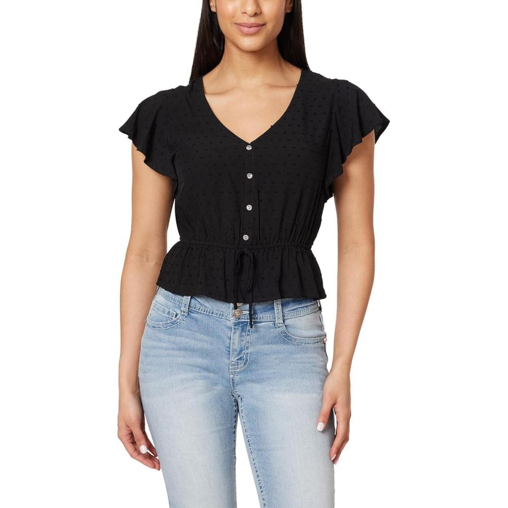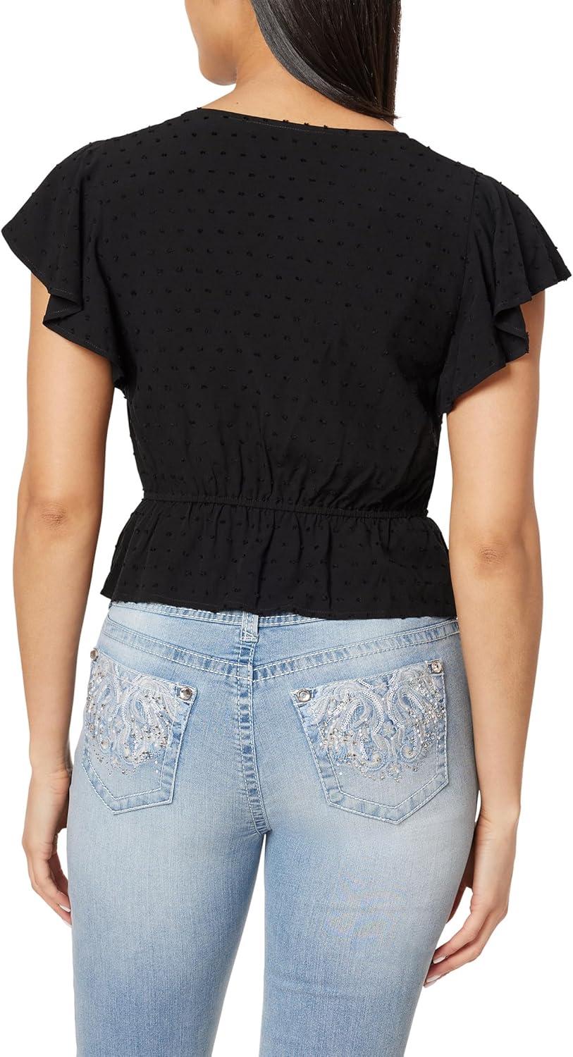 Elevate your wardrobe with our Women's Flutter Sleeve V-Neck Rayon Challis Swiss Dot Peplum Top, a perfect blend of charm and sophistication. Crafted from lightweight rayon challis, this blouse offers a breezy and comfortable fit. The delightful flutter sleeves and Swiss dot pattern add a touch of playful elegance, while the versatile V-neck and peplum silhouette enhance its chic appeal.