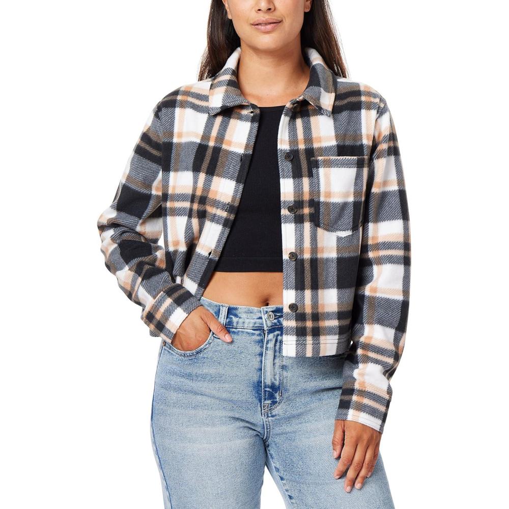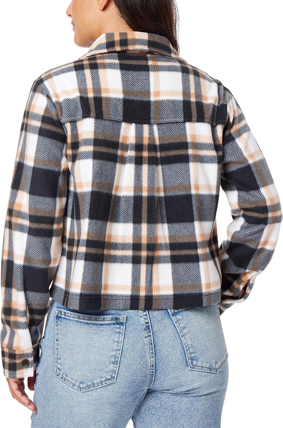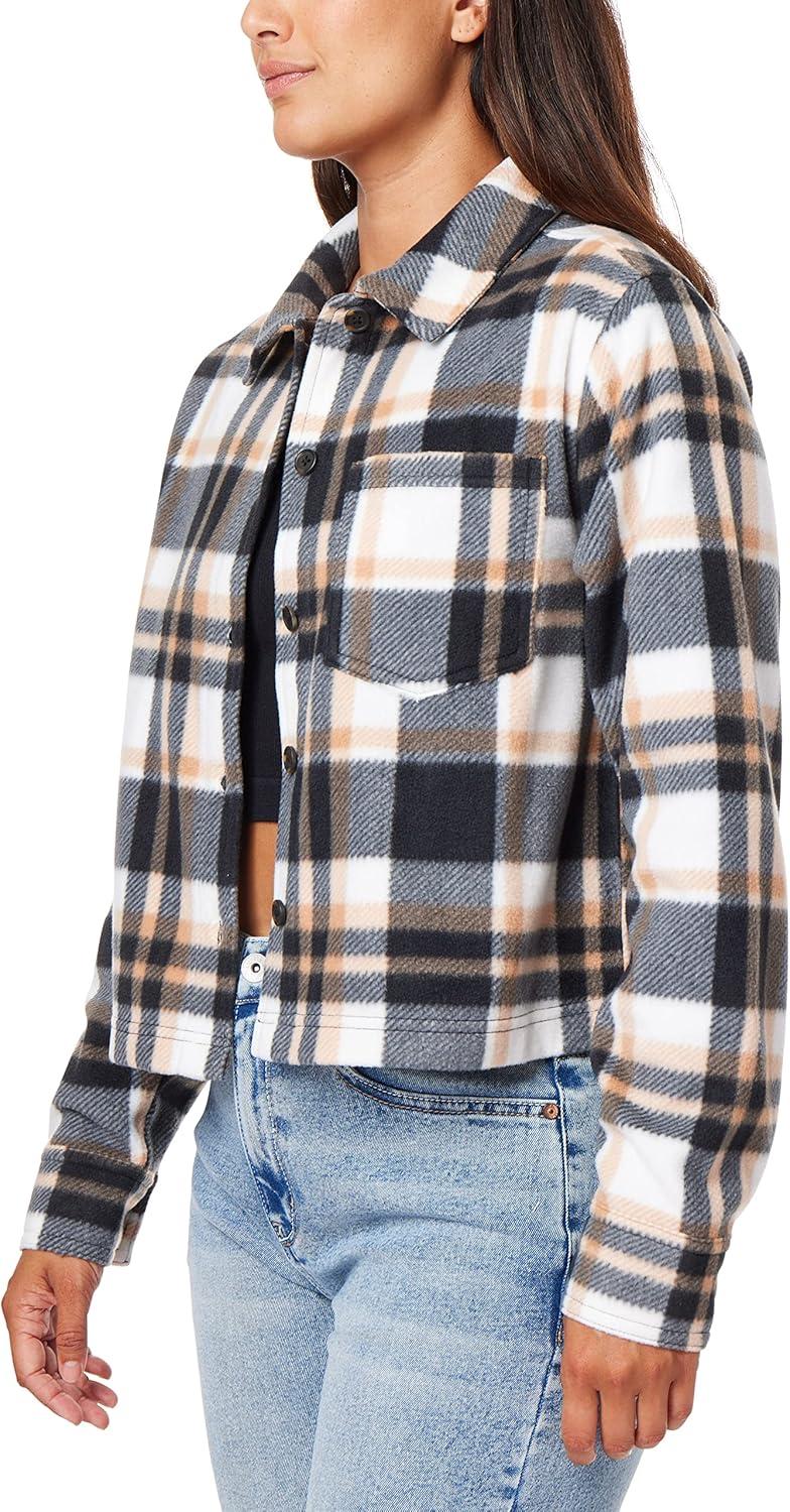 WallFlower Women's Chloe Polar Cozy Fleece Boyfriend Spring, Summer and Fall Light Shacket Jackets(Black White Plaid)