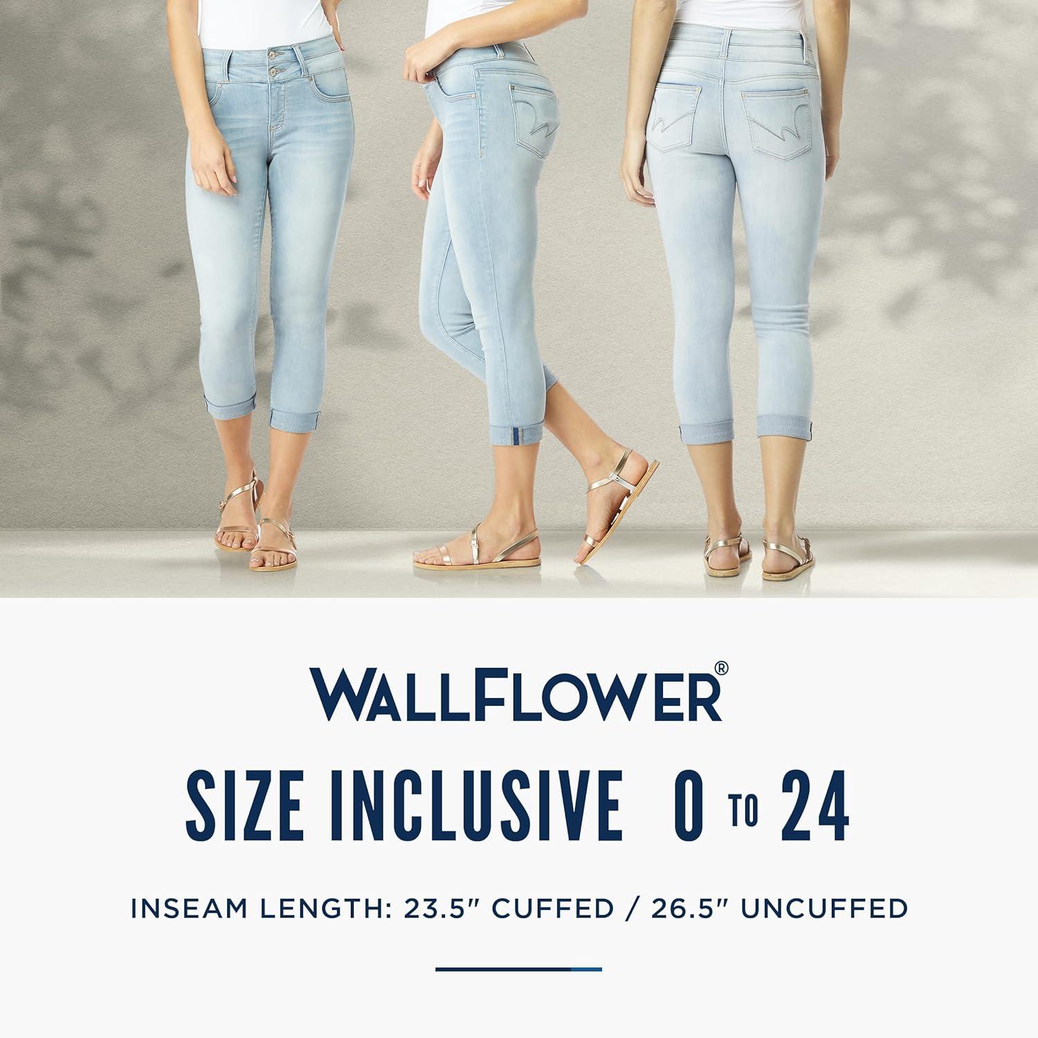 Womens wallflower jeans women jeans high waisted in Insta Soft denim are super soft, super comfy, super you! These crop jeans for women are made with over 60% Elasticity Power Stretch fabric with endless holding power and never bags out. The wallflower jeans womens jeans limitless stretch waistband ensures a flattering, gap-free fit that sculpts your curves and creates a sleek silhouette. These high-rise jeans for women style slims through the hips and thighs for a long, lean look, finishing with a skinny leg opening. Keep it sassy with faux front pockets for super smooth high waisted jeans for women. Combined with our signature super wide waistband and triple button closure detail. Maintain your cool and casual style whether you're on horseback or heading back to school with wallflower cropped jeans for women. wallflowers jeans will complete your 90s, y2k, festival and everyday looks. Look and feel amazing, from size 0 to 24. Find standard jeans, wallflower plus size jeans for women, plus size crop jeans. Made for Every Body. Period. Join wallflower in our journey to more eco-friendly processes for more sustainable garments. By 2026, we aim to source 50% of our cotton through the Better Cotton program—supporting water-efficient farming practices that benefit both farmers and the environment.